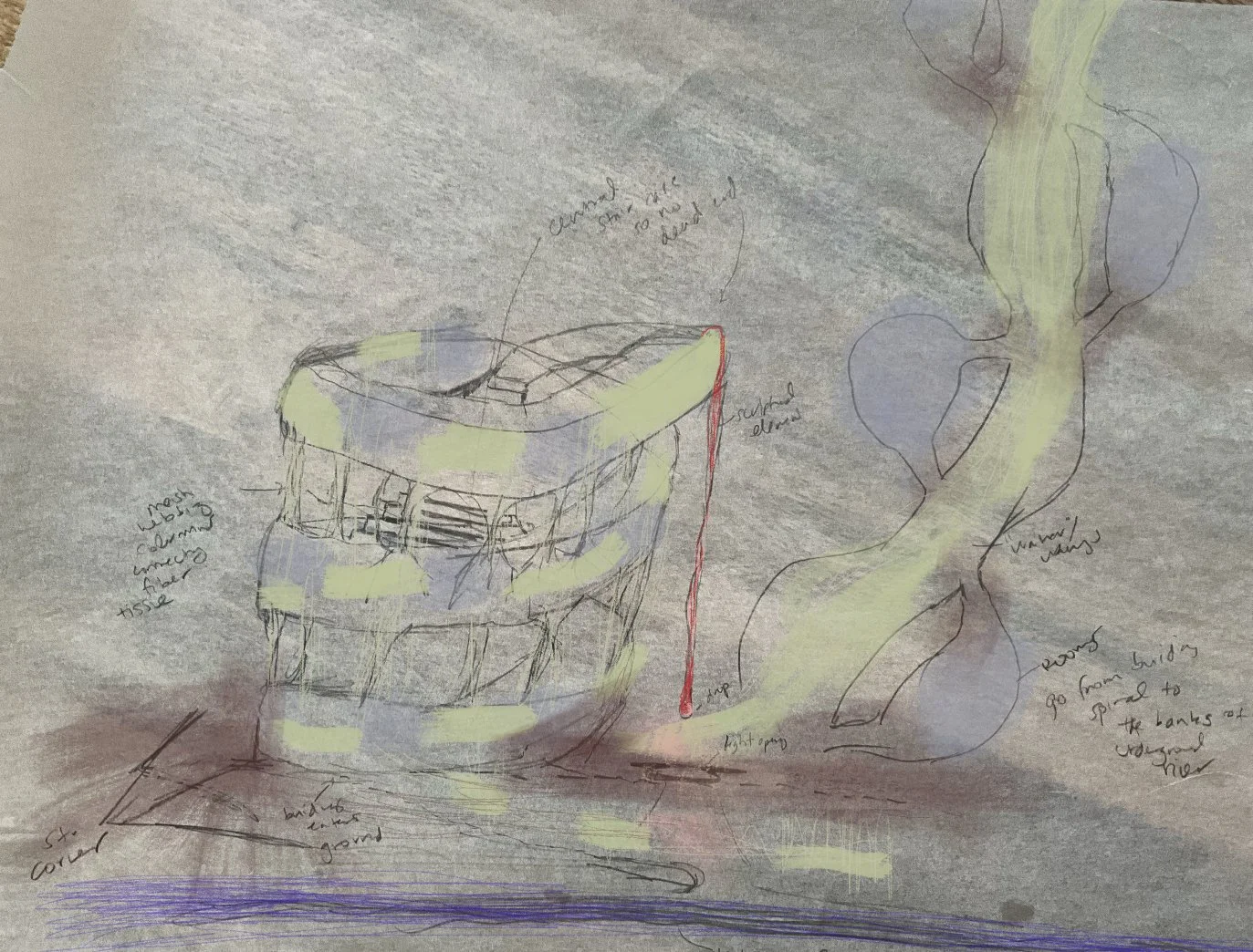 This speculative collage is a vision of the possibility of reworlding through selective unbuilding when using a male-to-female transsexual method to dismantle the categorical dichotomies that underpin patriarchal oppression. Although my inclination is to eliminate these structures completely, the pressing effects of climate collapse suggest an approach of deconstruction and salvage. In this vision, patriarchal structures of power undergo careful subtraction, containing space for transformation, while new forms emerge from the inside and establish new boundaries. Like a rhizomatic assemblage, this feminist reconfiguration unfolds its roots horizontally in a non-hierarchical way, disrupting imposed social patterns and transforming their meanings. The structure is partially buried within a compost pile made of the historical stratification of capitalist ruins, where luxury condos and high-end hotels are in different stages of decomposition. This sacred shellmound redefines the ontologies of waste through a decolonial practice that centers Indigenous spirituality as a mode of relationality that upholds justice.